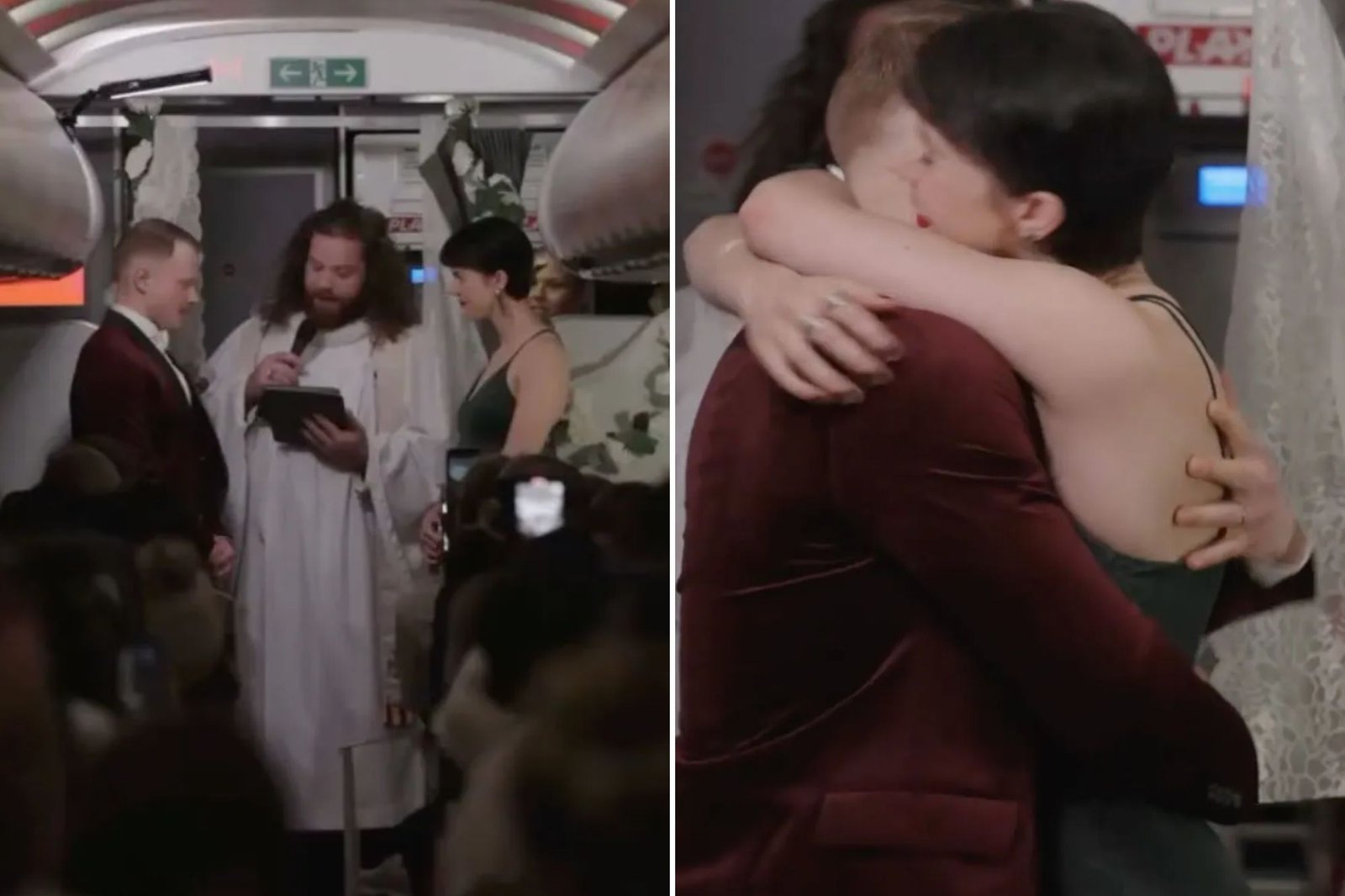 They tied knots and then celebrated with travelers, and as the champagne and flight attendants welcomed them, they turned to the Witnesses.