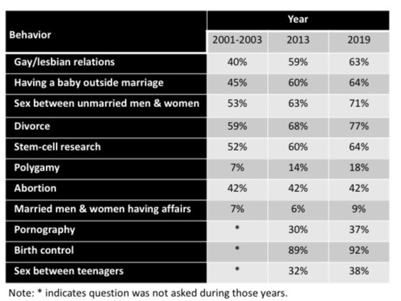 Check out the table below for a closer look at the numbers and how they have changed over the last two decades. Note that Gallup started asking about most of these topics in 2001-2003; however, they added more issues to the list around 2013 (including pornography, birth control, and sex between teenagers), which is why I put that year in the table as a reference point.