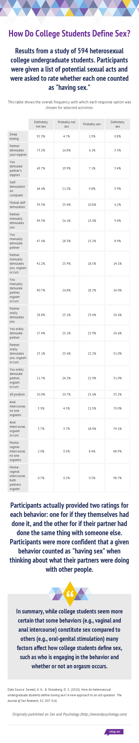 What does it actually mean to “have sex?” It depends who you ask. According to a new study published in the Journal of Sex Research, there is some pretty incredible variability in how college students personally define the term sex. There certainly seems to be a lot of agreement that things like vaginal and anal intercourse count as sex; however, students appear to be very split on whether things like oral sex and mutual masturbation count. It’s also important to note that even behaviors such as breast stimulation and cybersex are viewed as sex by some folks. Check out the infographic below to learn more.
