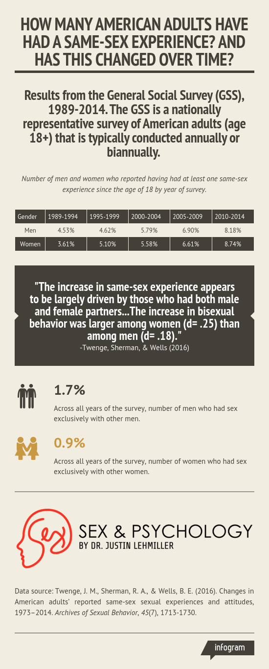 Since becoming an adult, how many Americans have ever had a sexual experience with someone of the same sex? And how has this number changed over time? According to a recent study published in the Archives of Sexual Behavior, 8-9% of American adults today have had a same-sex experience—a figure that has doubled since the late 1980s. Check out the infographic below for a closer look at the numbers and how they have changed over time.