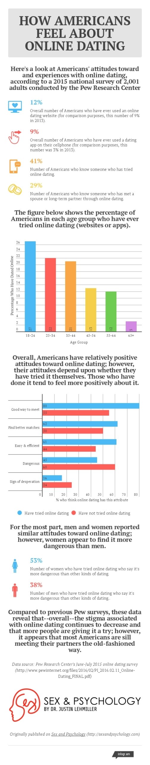 For a closer look at Americans’ attitudes toward and experiences with online dating and how these things are related to our age and gender, check out the infographic below. To learn more about research on online dating, including the ways in which it has changed our relationships, check out this article.