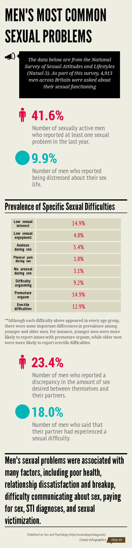 Sexual difficulties are incredibly common. In fact, data from nationally representative surveys suggests that nearly half of men and women report having experienced at least one sexual problem in the last year! Check out the infographic below for a closer look at men’s reports of sexual problems and some of the factors associated with them based on data from the most recent version of the National Survey of Sexual Attitudes and Lifestyles (Natsal-3). For a look at what this same survey has revealed about the most common sexual problems facing women, check out this infographic.