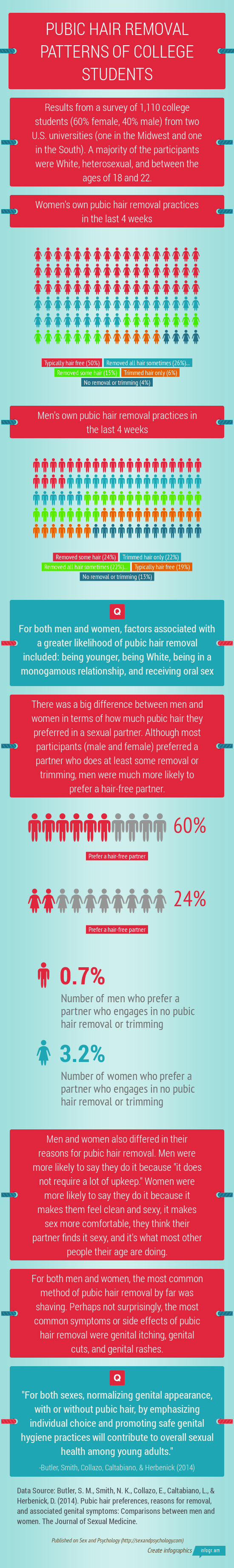Pubic hair removal has been the subject of a growing amount of research attention; however, surprisingly little work in this area has addressed the question of how men and women are similar or different when it comes to their pubic hair removal practices and preferences. How many people do it, why, what (if any) side effects are there, and how much pubic hair do they prefer on their sexual partners? A new study just published in the Journal of Sexual Medicine takes a look at these and other questions in a sample of college undergraduates. Check out the infographic below for a few of the key findings.