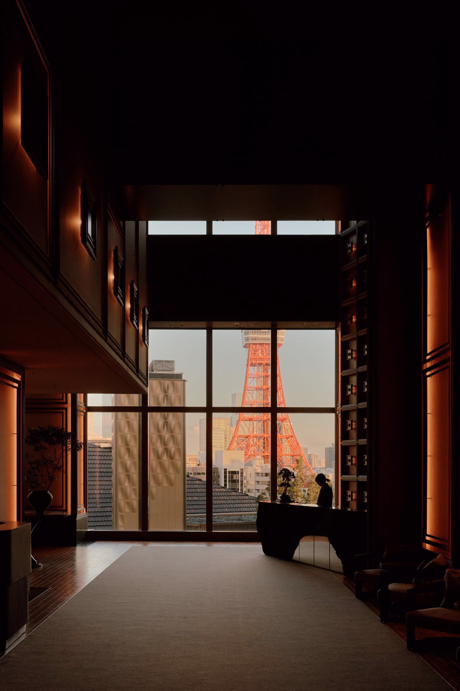 The arrivals area features a granite welcome counter, with stunning views of Tokyo Tower from the floor-to-ceiling windows opposite the counter. Thoughtful design details throughout the space blend European and Japanese influences. At the entrance, wainscot-like wall paneling sits alongside intricate lattice millwork and braided rope details inspired by the shurien nosu, a sacred rope in Japanese culture. Rooms and public spaces are elegant and stylish, decorated in understated tones to create a warm and relaxing feel.